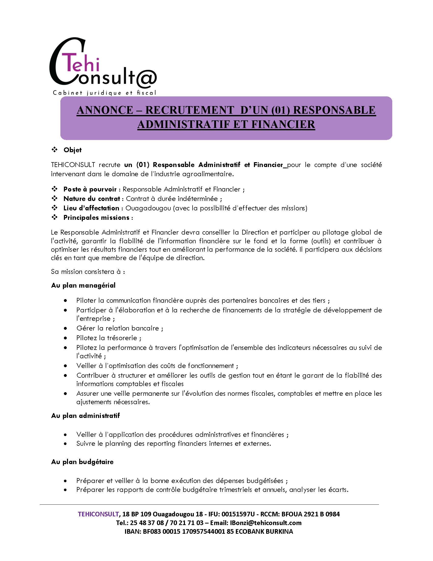 ANNONCE RECRUTEMENT : LE CABINET TEHI CONSULT RECRUTE POUR LE COMPTE D’UNE SOCIÉTÉ INTERVENANT DANS L’INDUSTRIE AGROALIMENTAIRE