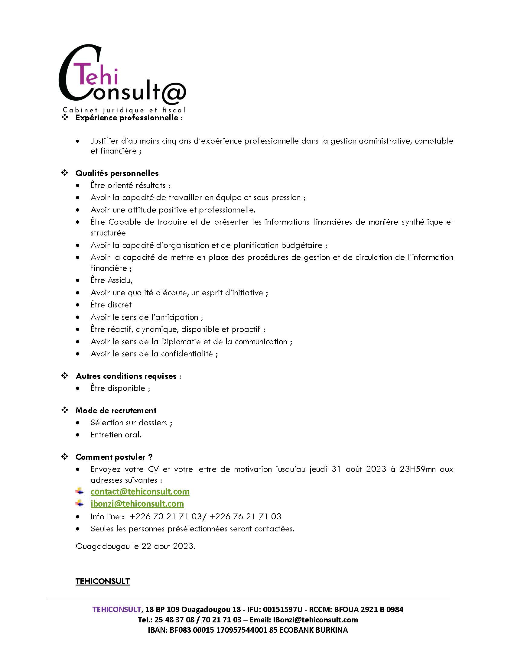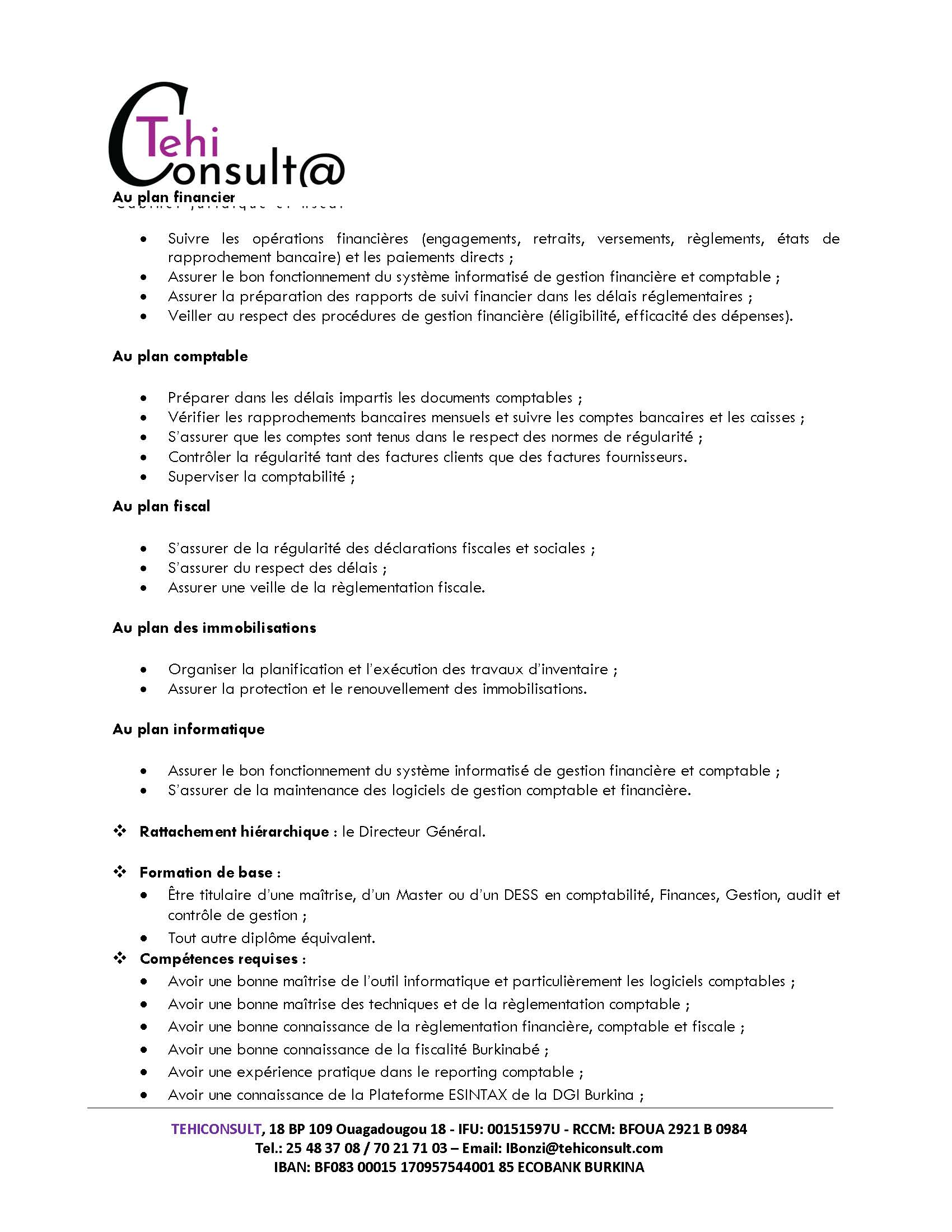 ❖ Lieu d’affectation : Ouagadougou (avec la possibilité d’effectuer des missions)