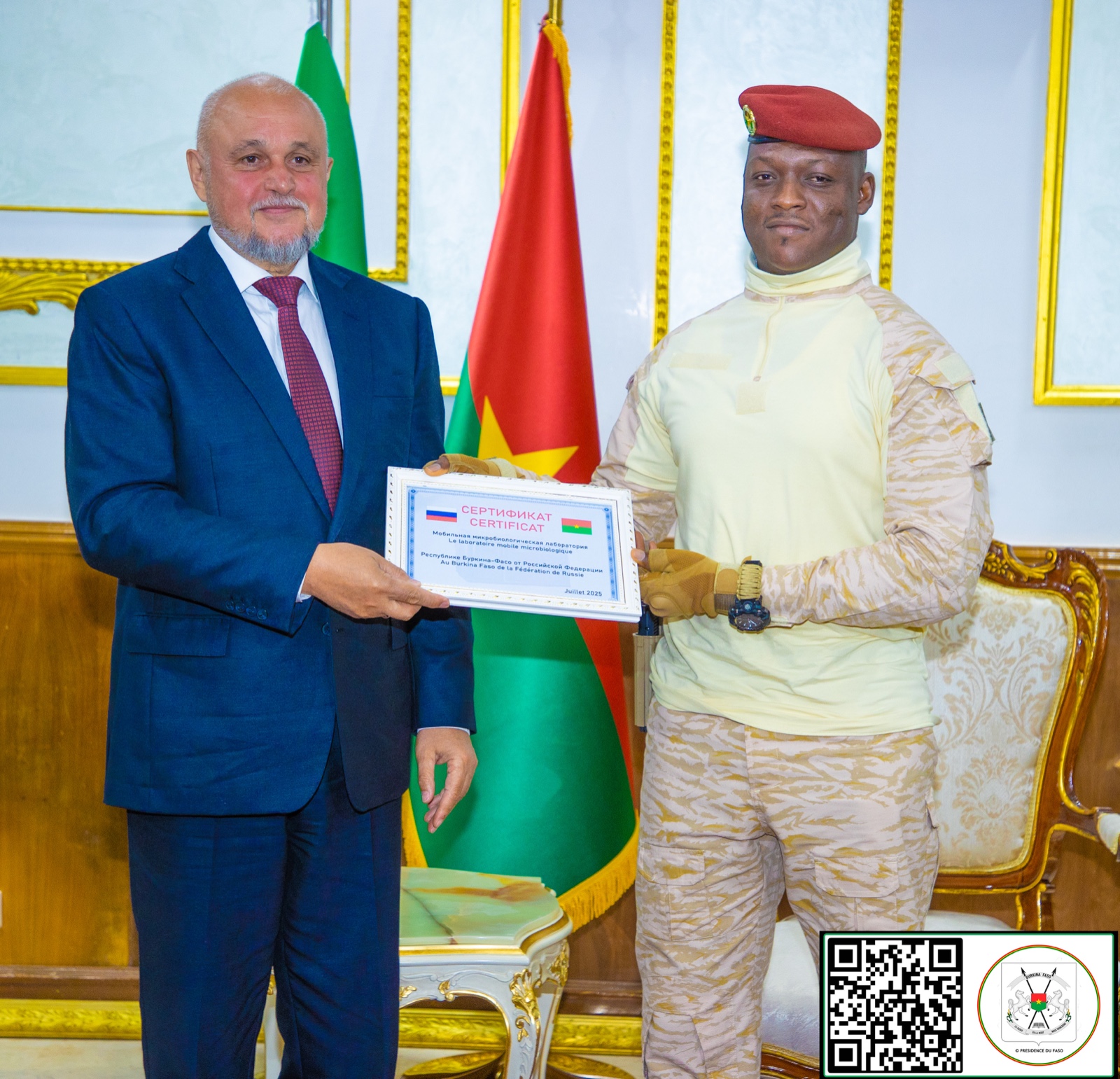 Un autre temps fort de cette audience a été la remise au Président du Faso du certificat d’un laboratoire mobile microbiologique, que la Russie entend déployer au Burkina Faso dans les mois à venir. Cet équipement vient appuyer la coopération scientifique entre les deux pays, notamment dans le domaine de la recherche et de la santé publique.