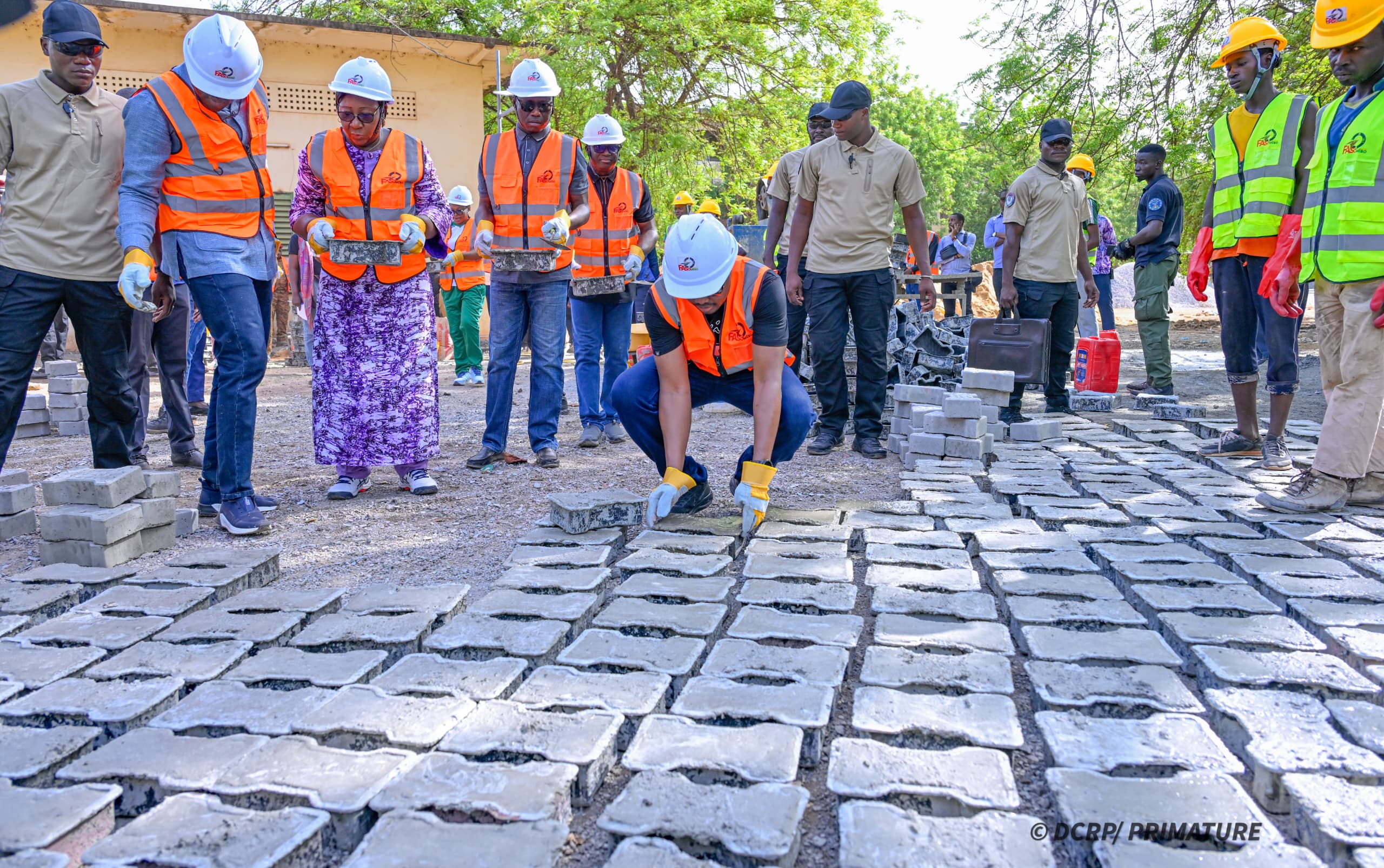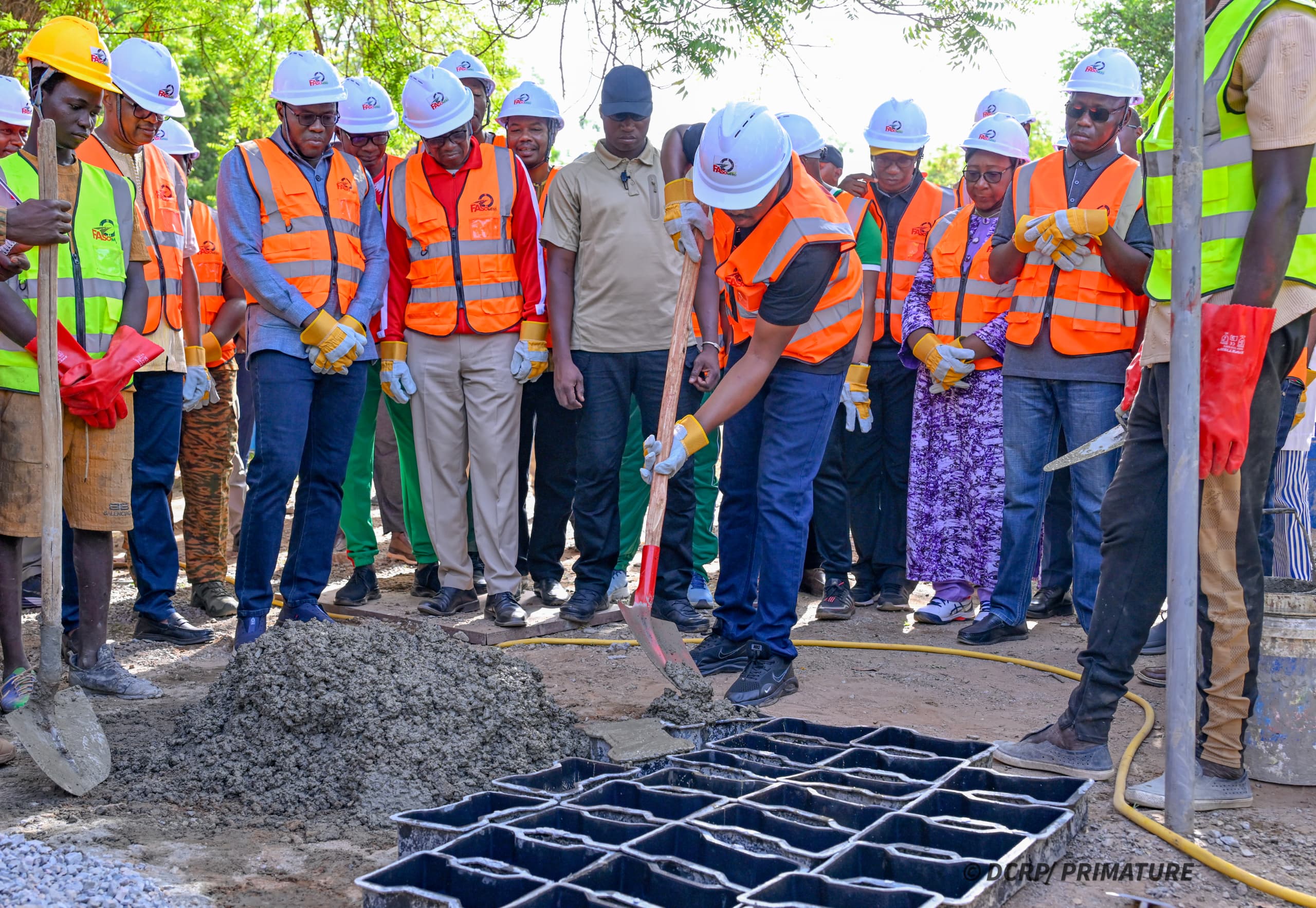 Sur place, le Premier ministre et les ministres ont visité les stocks de production composés de ciment, de sable et de quartz concassé, avant de participer eux-mêmes au gâchage du mortier et au remplissage des moules de pavés. Dans un élan symbolique fort, les membres du Gouvernement ont effectué une contribution collective de 150 tonnes de ciment pour soutenir l’initiative.
