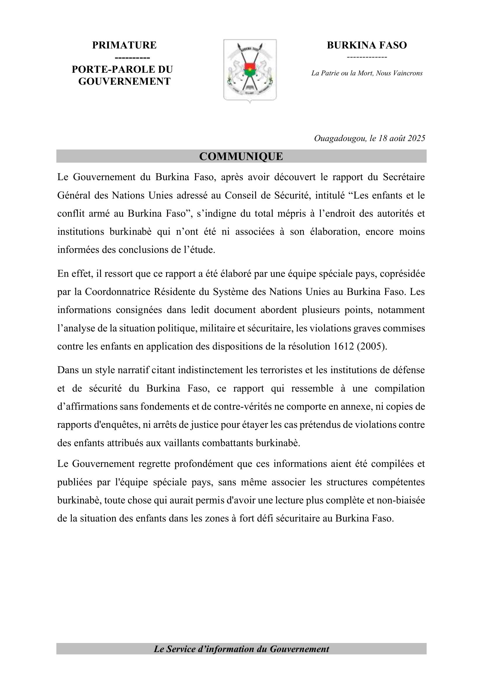 Cette décision fait suite à la publication du rapport du Secrétaire général des Nations Unies intitulé « Les enfants et le conflit armé au Burkina Faso », présenté au Conseil de sécurité sans consultation des autorités burkinabè. Le Gouvernement s’indigne de la méthode unilatérale et non documentée employée, dénonçant une compilation de contre-vérités mettant sur le même plan les terroristes et les forces de défense nationales.