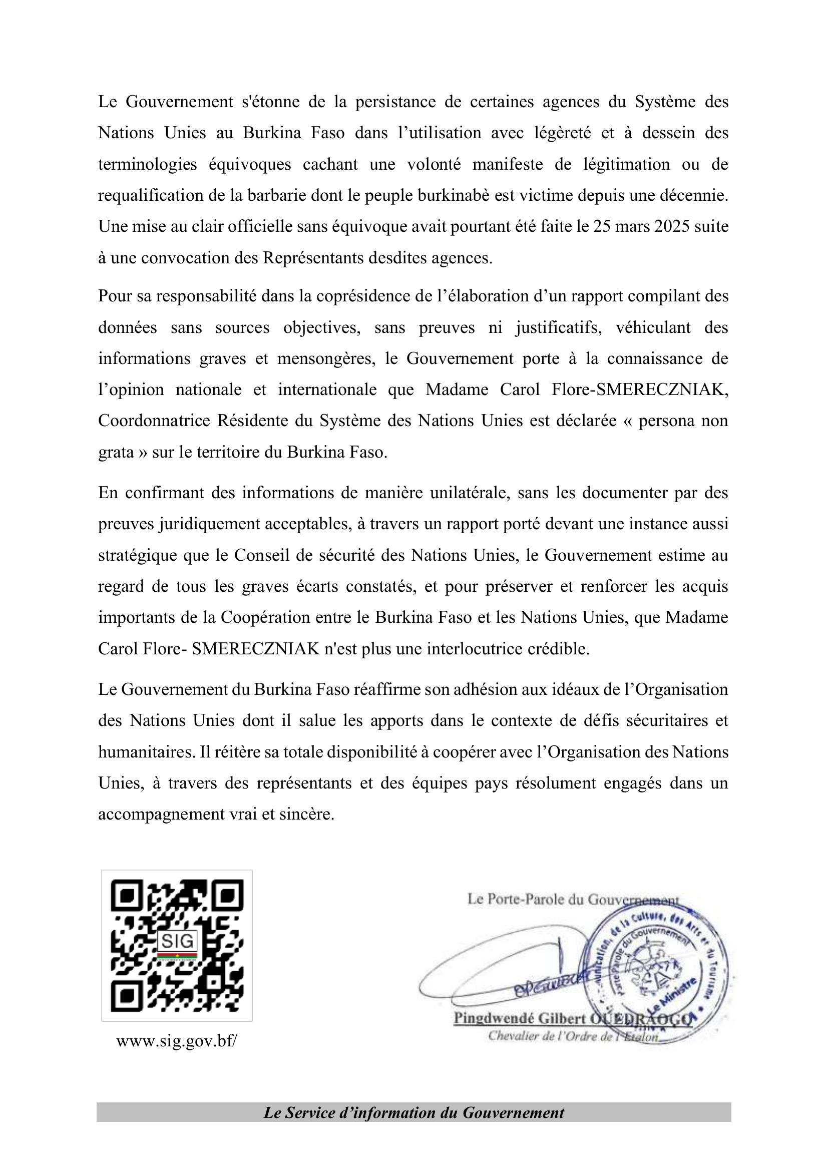 Dans un communiqué publié ce lundi 18 août 2025, le Gouvernement burkinabè déclare persona non grata Madame Carol Flore-SMERECZNIAK, Coordonnatrice Résidente du Système des Nations Unies au Burkina Faso.