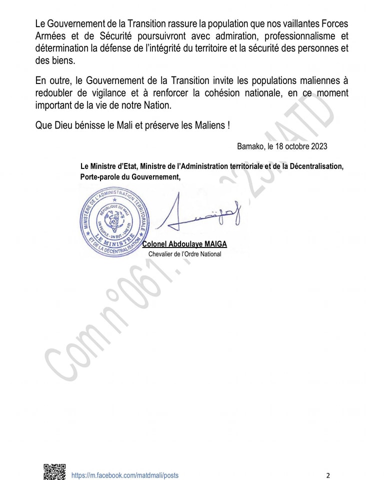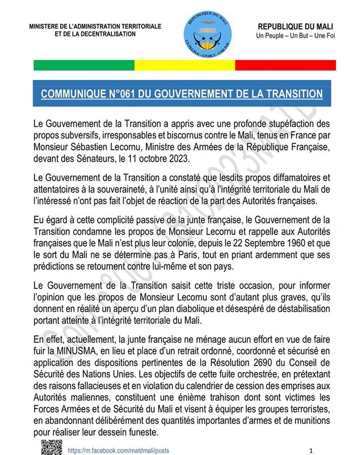 Le Gouvernement de la Transition condamne les propos subversifs, irresponsables et biscornus contre le Mali, tenus par Monsieur Sébastien LECORNU, Ministre des Armées de la République Française, devant des Sénateurs, le 11 octobre 2023.