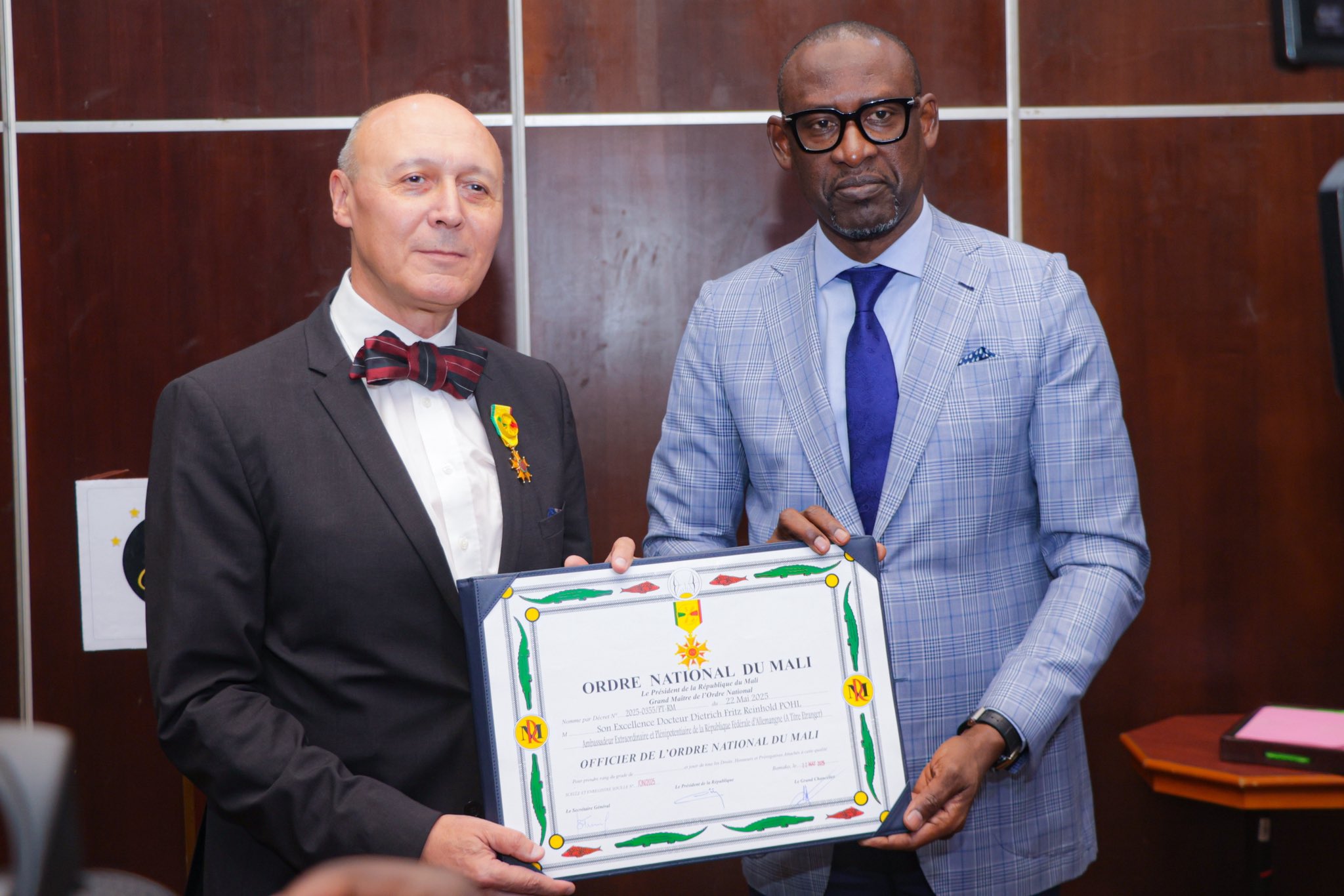 À cette occasion, et au nom du Président de la Transition, Chef de l’État, Son Excellence le Général d’Armée Assimi GOÏTA, le Chef de la diplomatie malienne a élevé l’Ambassadeur POHL au grade d’Officier de l’Ordre national du Mali à titre étranger, en reconnaissance de son engagement remarquable au service de l’amitié et de la coopération entre les deux pays.
