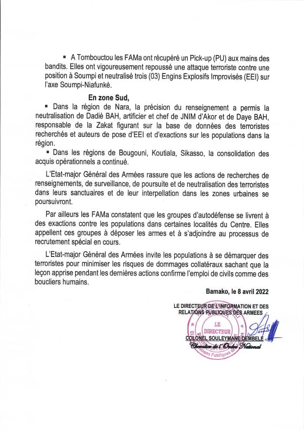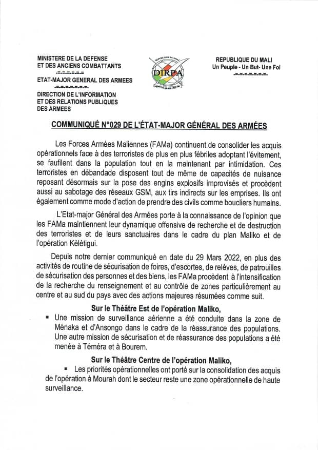 Dans le cadre du plan « maliko » et de l’opération « kèlétigui », les forces armées Malienne dans une déclaration affirme avoir engrangé des victoires sur le terrain comme suit :