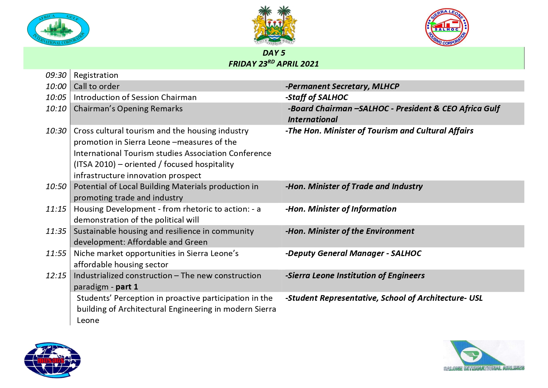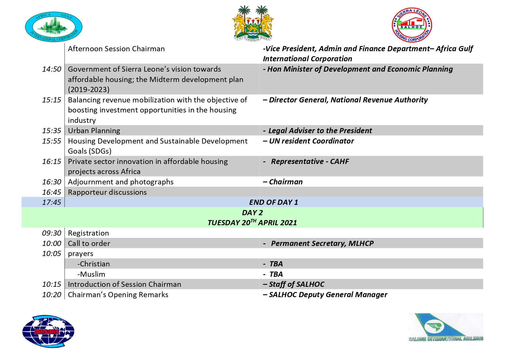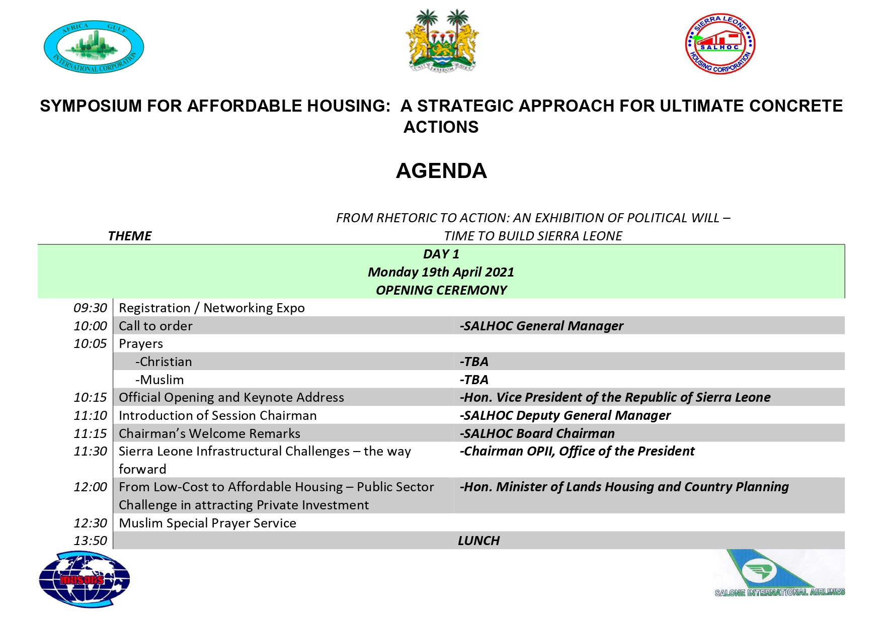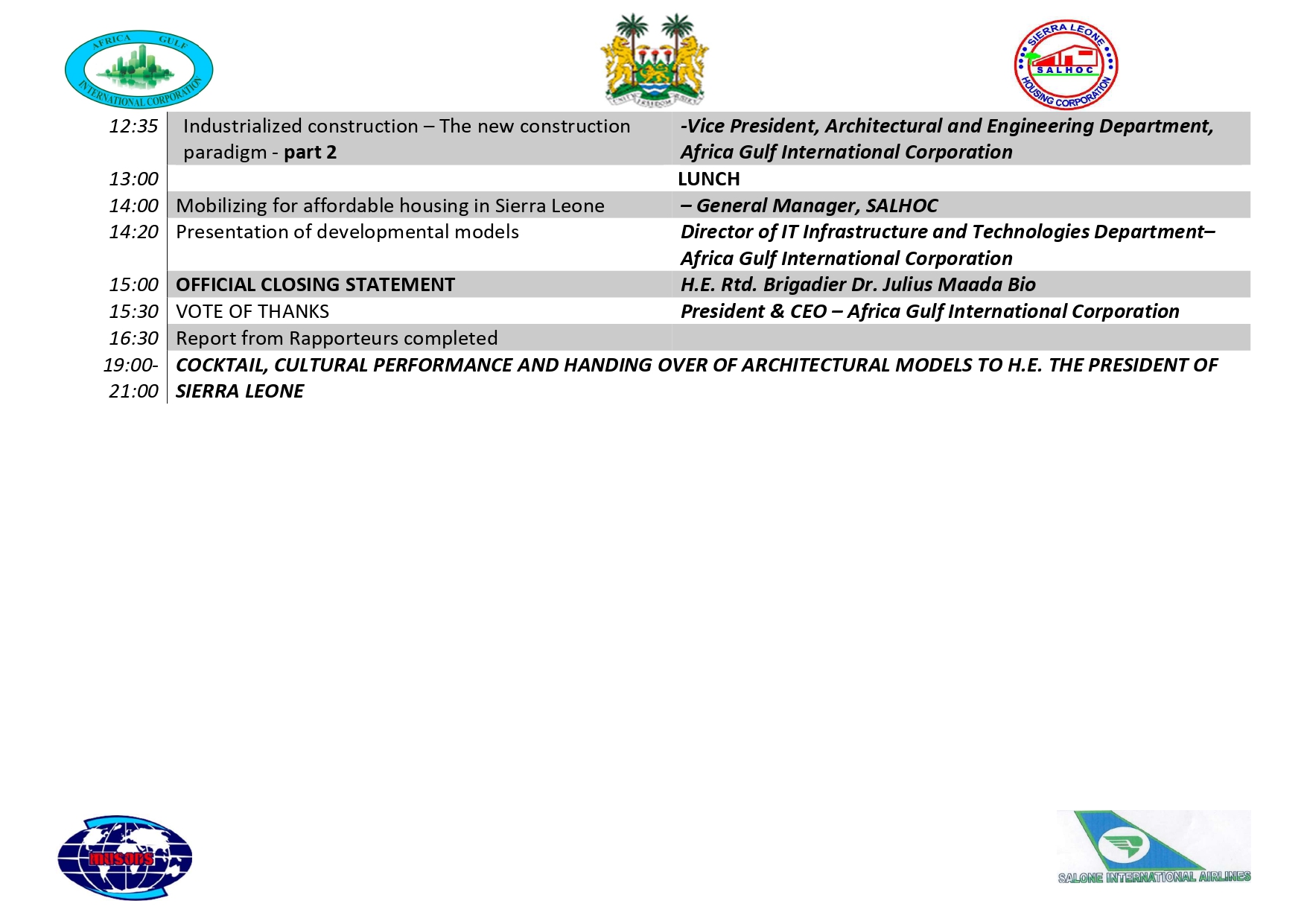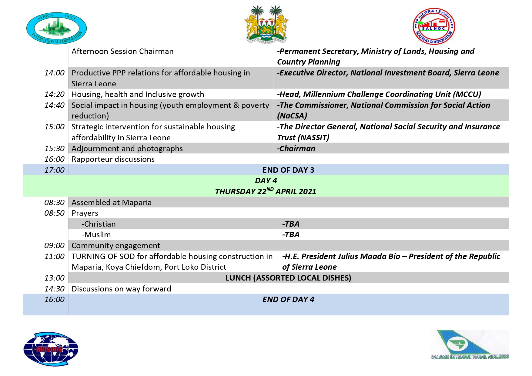 Pour en revenir aux travaux du symposium proprement dits il est prévu une cérémonie d’ouverture le mardi 19 avril sous la présidence du Vice-président de Sierra Leone, Mohamed Juldeh Jalloh assisté des ministres des Territoires, du Logement et de l’Environnement, Denis Sandy et de son collègue du développement et de la planification économique, Francis Mustapha Kaikai.